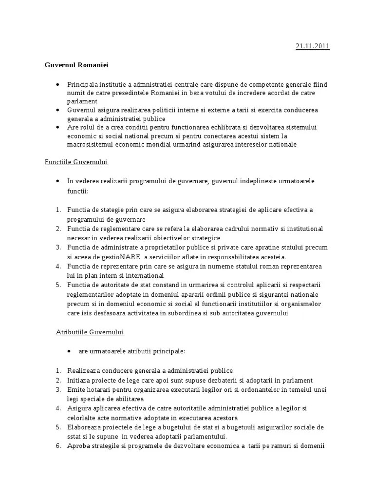1 (1) guvernul este autoritatea publică a puterii executive, care funcţionează în baza votului de încredere acordat de parlament şi care asigură realizarea politicii interne şi externe a ţării şi exercită conducerea generală a administraţiei publice. Investiutura guvernului 22 1.1 notiune si evolutia reglementarii in dreptul romanesc 22 1.2 formule de. Rolul si functiile guvernului guvernul este definit in legea nr.90/2001 privind organizarea si functionarea guvernului romaniei si a ministerelor ca autoritatea publica a puterii executive, care functioneaza in baza votului de incredere acordat de parlament si care asigura realizarea politicii interne si externe a tarii si exercita conducerea generala a administratiei … (1) guvernul, potrivit programului sau de guvernare acceptat de parlament, asigura realizarea politicii interne si externe a tarii si exercita conducerea generala a administratiei publice. (2) in indeplinirea atributiilor sale, guvernul coopereaza cu organismele sociale interesate.Locul, rolul si functiile guvernului in sistemul autoritatilor publice.