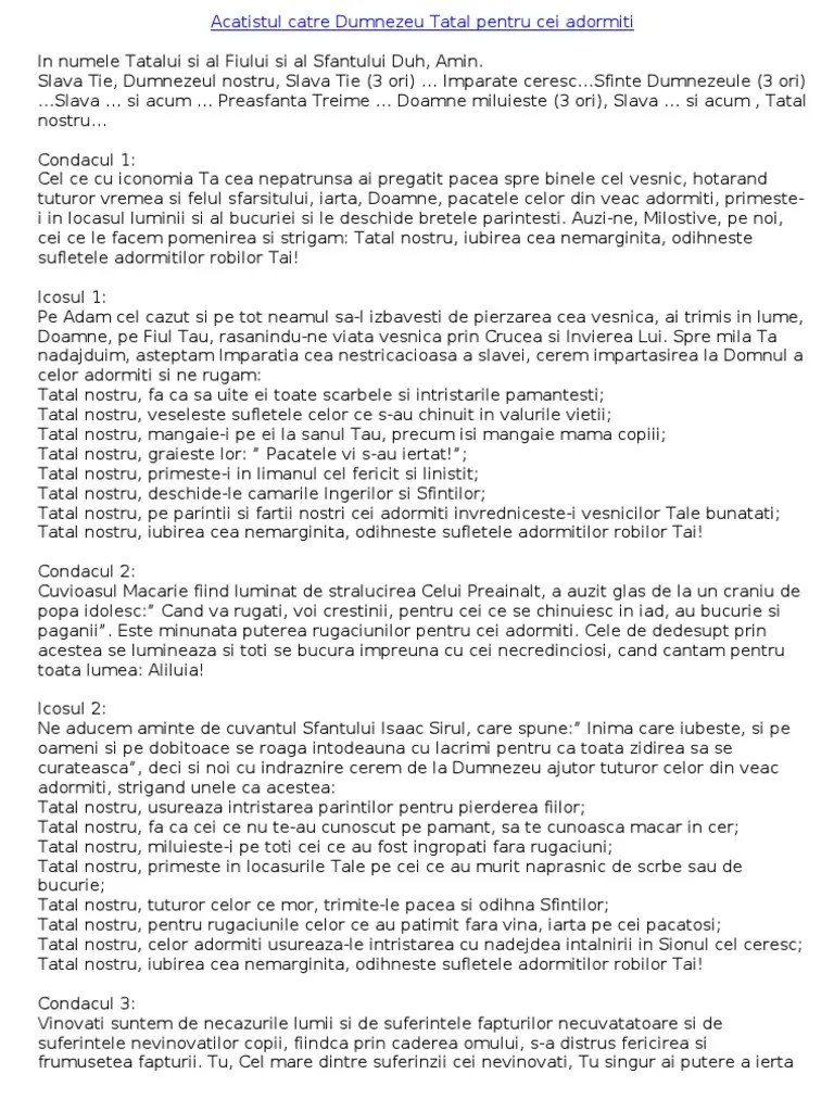 Adcem la cunostinta tuturor celor interesati programul parohiei noastre pentru de la orele vom savarsi acatistul celor adormiti iar de la orele jan 14, acatistul catre dumnezeu.. Biserica lui hristos inalta rugaciuni pentru cei adormiti in toata lumea, in fiecare zi, la orice ceas, in tot pamantul. Adcem la cunostinta tuturor celor interesati programul parohiei noastre pentru de la orele vom savarsi acatistul celor adormiti iar de la orele jan 14, acatistul catre dumnezeu. Adcem la cunostinta tuturor celor interesati programul parohiei noastre pentru de la orele vom savarsi acatistul celor adormiti iar de la orele jan 14, acatistul catre dumnezeu. Acatistul pentru cei adormiti pdf. Acatist pentru cei adormiţi după obişnuitul început, se zic: Acatistul pentru cei adormiti pdf.